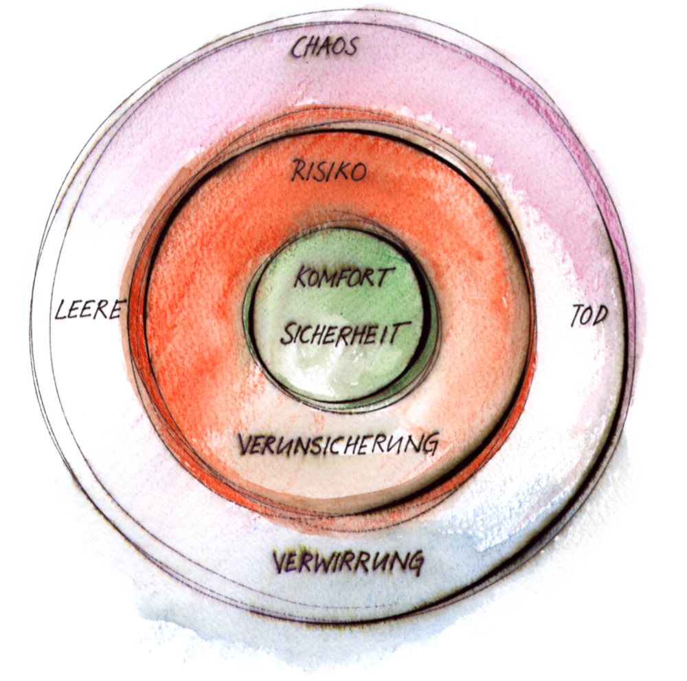 In der Erlebnispädagogik gibt es ja das methodische Konzept des sogenannten Komfortzonenkreis: Innen ist der Komfortraum, dann der Risikoraum und dann der äusserste Ring mit den Begriffen Leere, Chaos, Tod und Verwirrung.